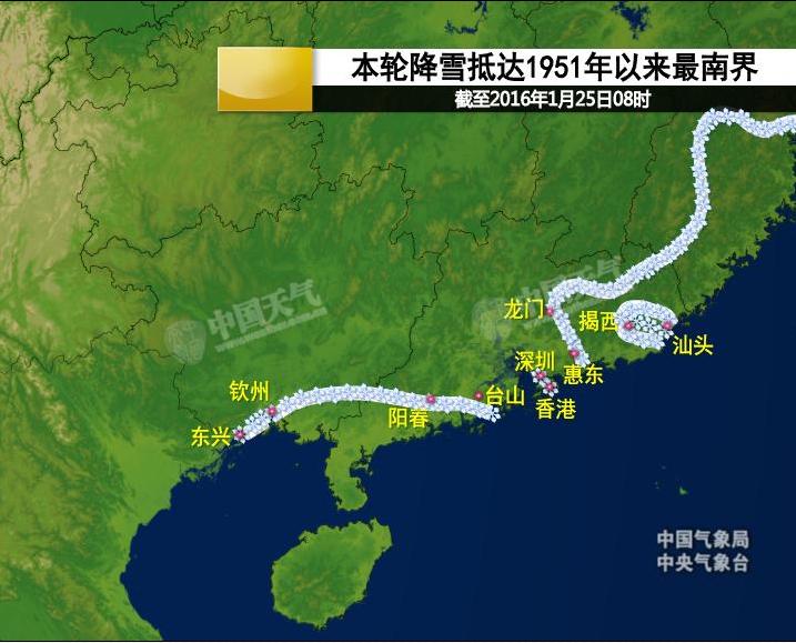 气温创新低、破极值,雨雪也不甘示弱。长江中下游地区的最低气温逼近零下10℃,0℃线越过了南岭,深入华南地区。广东、广西、香港、台湾等地陆续出现降雪天气,对不少地区来说都是有气象记录以来唯一仅有的一次降雪。此次降雪也打破了1951年有气象记录以来的最南“底线”。以广州为例,资料显示,广州近50年来总共下过三次“雪”,之所以打上引号,是因为其中两次是雪籽,分别出现在1971年1月30日的花都以及1983年1月22日的从化,另外一次是在1967年下过的雨夹雪。而如此明显的大规模纯雪则要追溯到民国时期。难怪当地的小伙伴喜大普奔,纷纷晒雪景,激动欢呼“活久见”了。