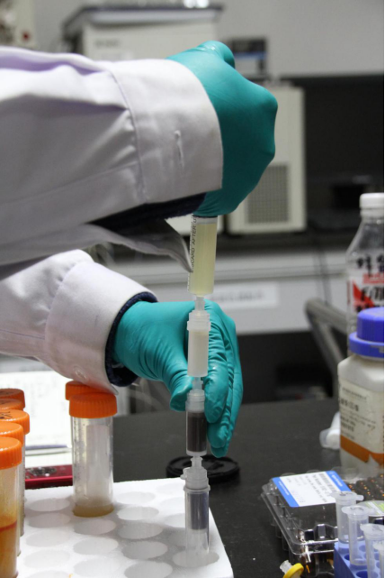05.将分离出的液体置入注射器中,并将注射器用一个油处理柱和两个氯处理柱连接在一起,对已经固液分类的火锅汤进行过滤。