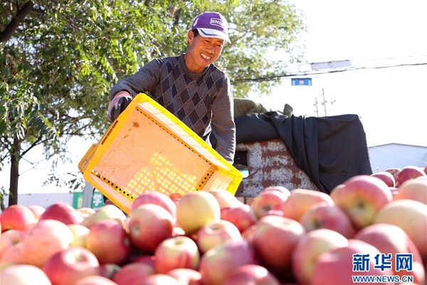 宁夏中卫市沙坡头区永康镇彩达村,果农将苹果装车,准备出售 图片来源:新华网