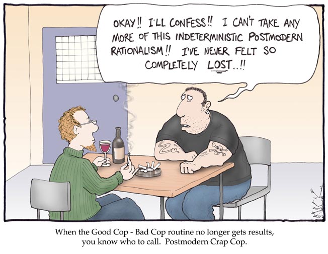 审犯人时,如果红脸黑脸这套也不管用的话,就是后现代废话警察大展身手的时候了。