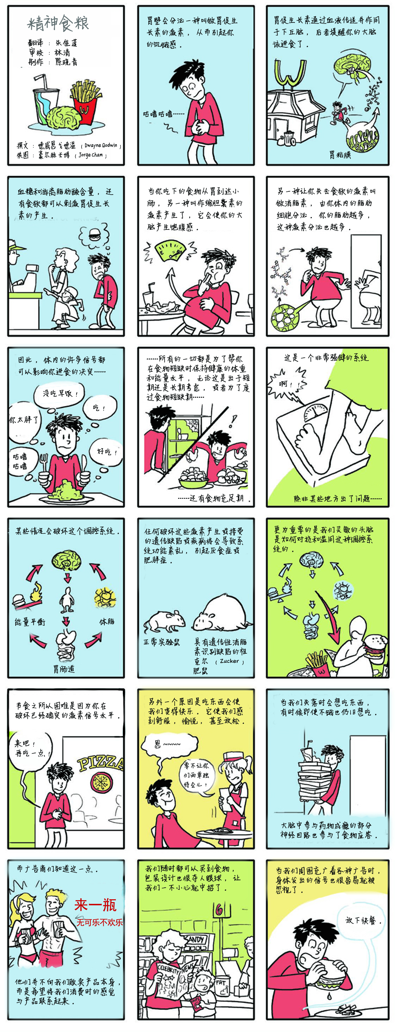 胃壁会分泌一种叫做胃促生长素的激素从而引起你的饥饿感,而当你吃下的食物从胃到达小肠,另一种叫做缩胆囊素的激素产生了,它会使你的大脑产生饱腹感。而吃,也不仅仅是生物激素的调控,还受很多环境因素影响。