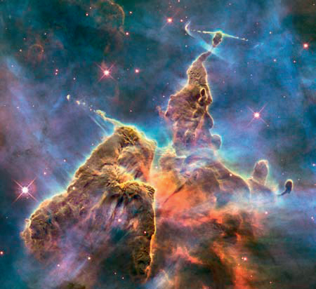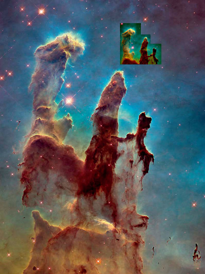 右上角这张照片拍摄于1995 年,也是哈勃拍摄的照片中被使用得最多的一张,常常出现在海报、T 恤和屏保上。“创生之柱”拍摄的是鹰状星云[Eagle Nebula,M16,位于巨蛇座(Serpen),距离地球6 500 光年] 中心由星际气体和尘埃组成的柱状结构。这3 根长度为4 光年的柱子是一团巨大的分子云的残留物。这团分子云是一个“恒星制造厂”,年轻恒星诞生后,产生的星风和紫外辐射让原来的气体云瓦解,将气体“吹”成了这个形状,就好像是岩层风化后留下的石柱一样。20 年后,哈勃再次拍摄了同一区域。最新的拍摄技术让“创生之柱”的图像分辨率更高,对比更鲜明。新照片为我们研究星云的形成提供了更加丰富的细节。图片中不同的颜色源于不同波段的多重曝光。