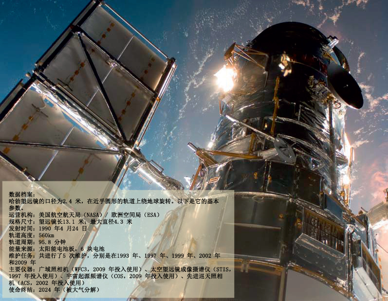 对哈勃的维护工作可直接在轨道上进行,目前已展开了5 次维修和升级任务,都是宇航员搭载航天飞机上太空执行的。最近一次维护是2009年5 月,宇航员搭乘“亚特兰蒂斯”号(Atlantis)航天飞机到达哈勃望远镜所在的位置,为其安装新的仪器,更替旧的陀螺仪和电池组。这次维护不仅全方位提高了哈勃望远镜的观测性能,而且还延长了它的服役期。