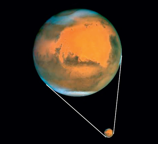 由于火星体积较小,天文学家要想观察到它,可得费一些力气:图中下方那个小圆点是与上一张照片中的土星按同样比例缩小的火星。尽管如此,哈勃还是可以分辨出火星表面16 千米尺度的细节。在这张2001 年6 月26 日拍摄的照片中,就可以清楚地看到冰晶组成的白色云层和橙色的沙尘暴。