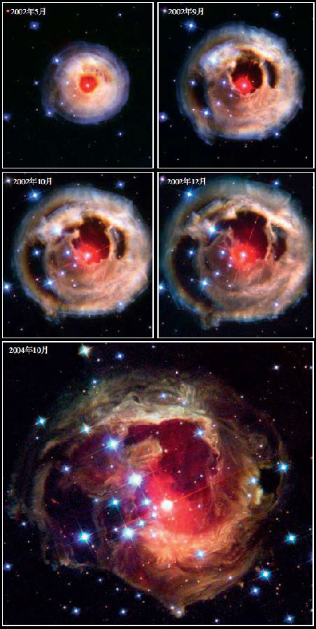 有时候,只看影像会导致我们误判。比如,如果我们将红超巨星麒麟座V838 在2002 年5 月至2004 年10 月的照片进行对比,可以看到,在恒星本身——图中红色核心——膨胀的同时,它周围的尘埃云似乎也在扩散,而实际情况是,这只是“光回波”(light echo) 效应造成的一种错觉。尘埃云本身没有膨胀,只是恒星发出的光芒被尘埃云所反射,形成光回波,在地面观察者看来似乎是发生了膨胀。也就是说,由于光传播速度有限,我们只能看到周围的尘埃云从里到外依次被这颗恒星照亮,而不是一下全部照亮,所以看上去就好像是尘埃云在膨胀(以上各图均为同尺度)。
