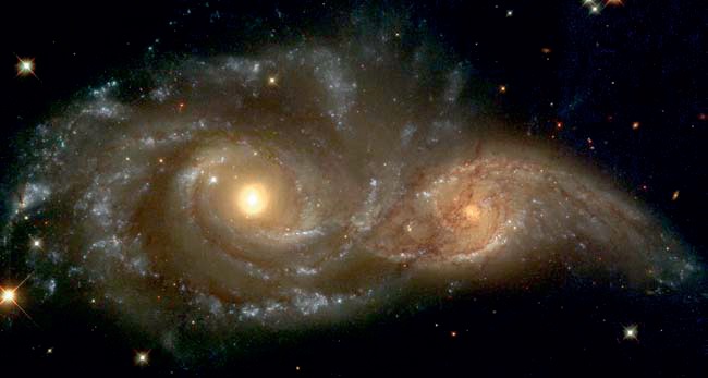 NGC 2207(左边)和IC 2163(右边)是位于大犬座(Canis Major)内的一对旋涡星系,它们就像是一对宇宙的舞者——已经在宇宙的大舞台上表演了数十亿年。在万有引力的作用下,规模较小的那个星系发生了严重的变形,星系中被撕扯出来的气体和恒星,向右延伸了大约10 万光年。在遥远的未来,这两个星系将会融合成一体。