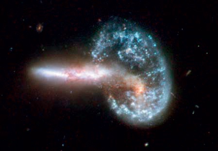 Arp 148 得名于它在著名天文学家霍尔顿·阿普(Halton Arp)编撰的《特殊星系图集》(catalog of peculiar galaxies compiled )中的编号——148。它是一对正在发生碰撞的星系,位于大熊座内,距离地球5亿光年。碰撞的结果是这个由环状星系和一段尾巴组合成的新天体——两个星系撞击时产生的激波把物质抛射出来,让它们呈环状分布。因为恒星的个头与它们之间巨大的间隔相比实在微不足道,所以在这次宇宙灾变中,恒星都是毫发无伤的,只是运动的轨迹发生了改变。