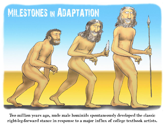 为了与教材中原始人的形象相吻合,两百万年前赤裸的男性原始人自然进化出右脚在前的姿势。