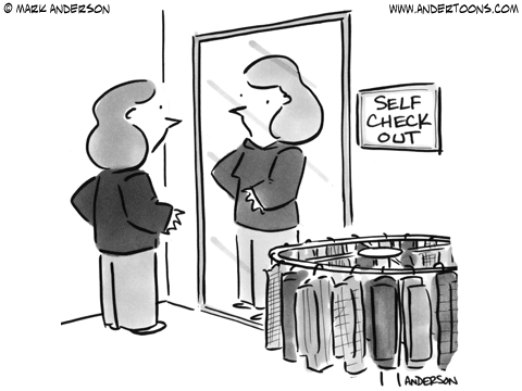 在商场里,一位女士正专注地盯着购物区的镜子”自我检查“。