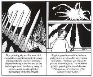 屋顶上全副戒备,精心设计的系统监测着尾部释放红色可见光的装置。致命的弹头排成行,在月光下发出清冷的光。