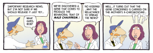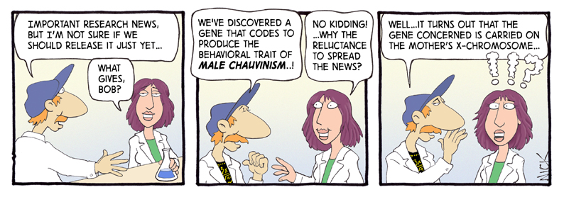 男:我们最近发现了一种基因,与男性沙文主义有关。这一基因通常携带在妈妈的X染色体上。