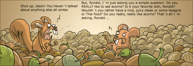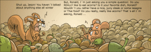 “可我只是在问你一个简单的问题:你真的喜欢橡子吗?这是你最喜欢吃的吗?你为什么不来点美味多汁的烤肉,或者烤宽面条,或者泰国菜?你是真的发自内心喜欢橡子吗?我只想问这个……”