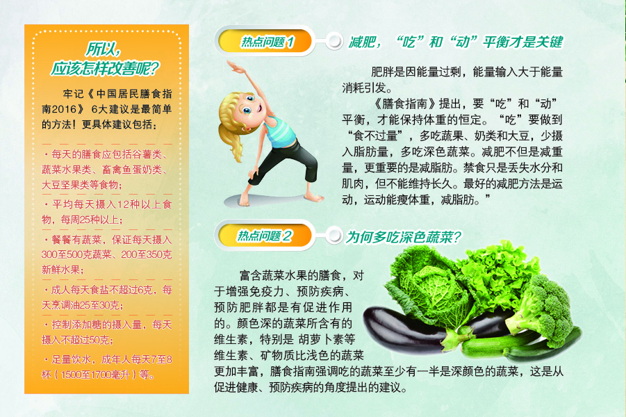在此,就如下2个热点的建议也要特别注意哦!(1)要“吃”和“动”平衡,才能保持体重的恒定。最好的减肥方法是运动,运动能瘦体重,减脂肪。(2)从促进健康、预防疾病的角度出发,强调吃的蔬菜至少有一半是深颜色的蔬菜。