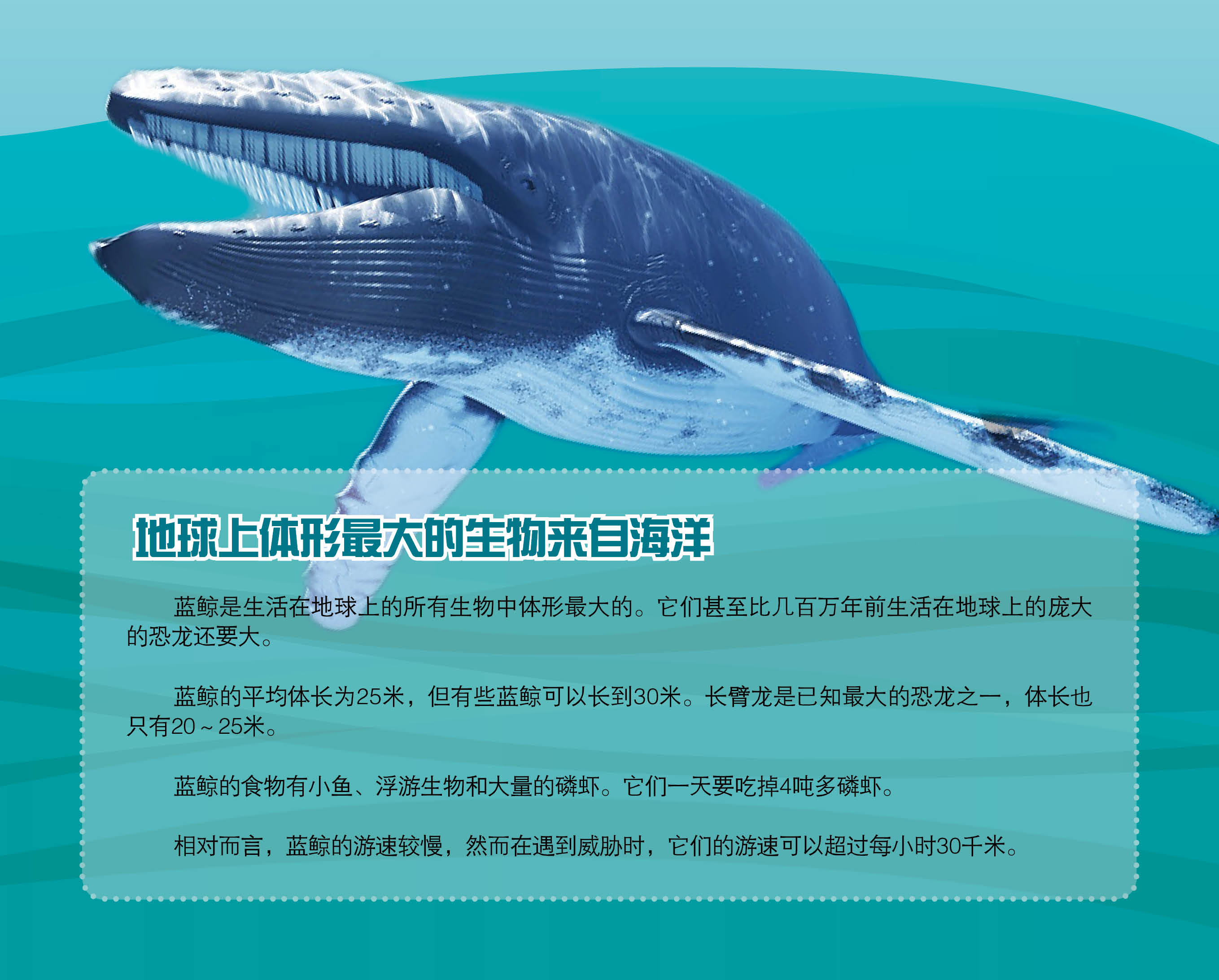 蓝鲸是生活在地球上的所有生物中体形最大的。它们甚至比几百万年前生活在地球上的庞大的恐龙还要大。