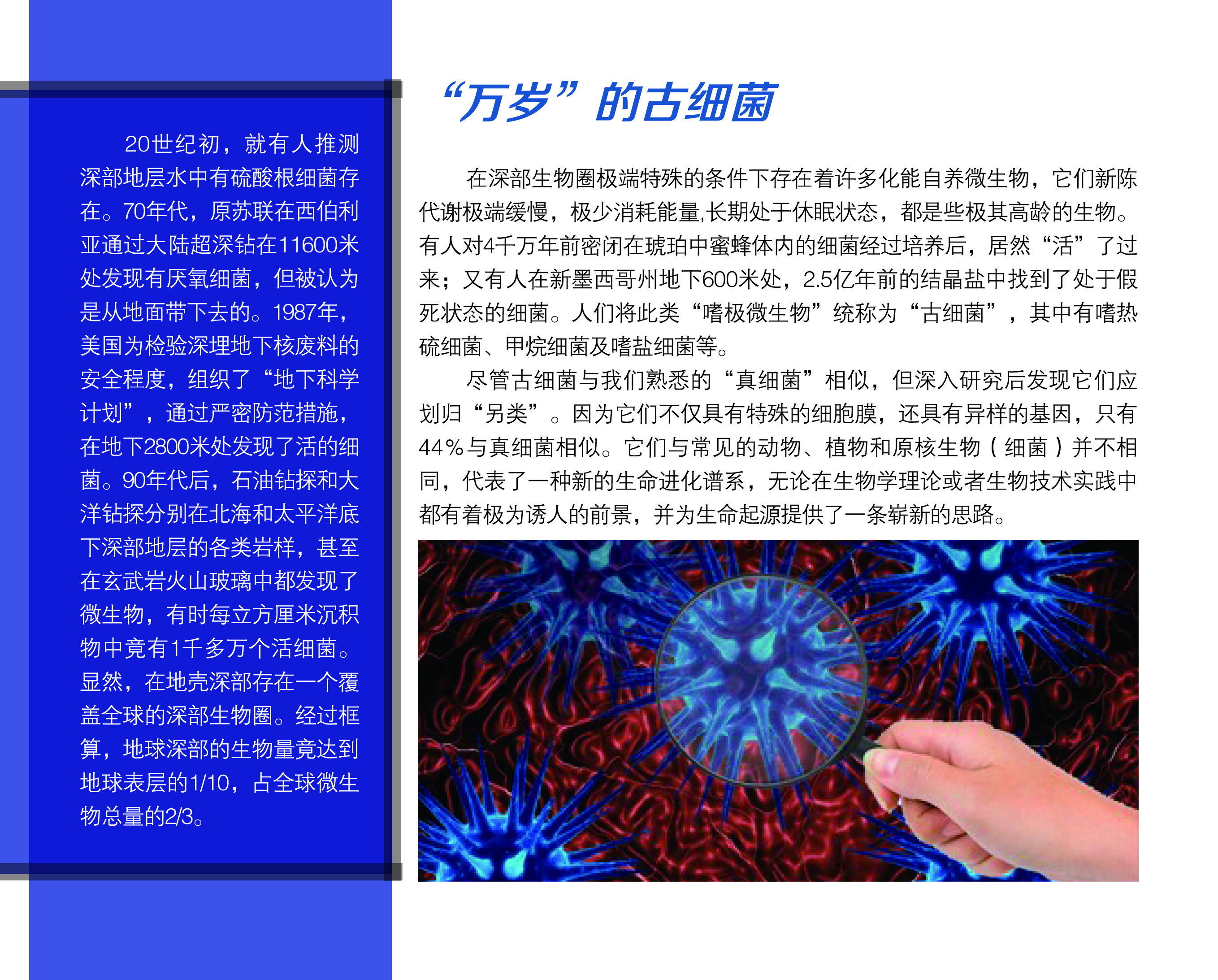 在地壳深部存在一个覆盖全球的深部生物圈。经过框算,地球深部的生物量竟达到地球表层的1/10,占全球微生物总量的2/3。