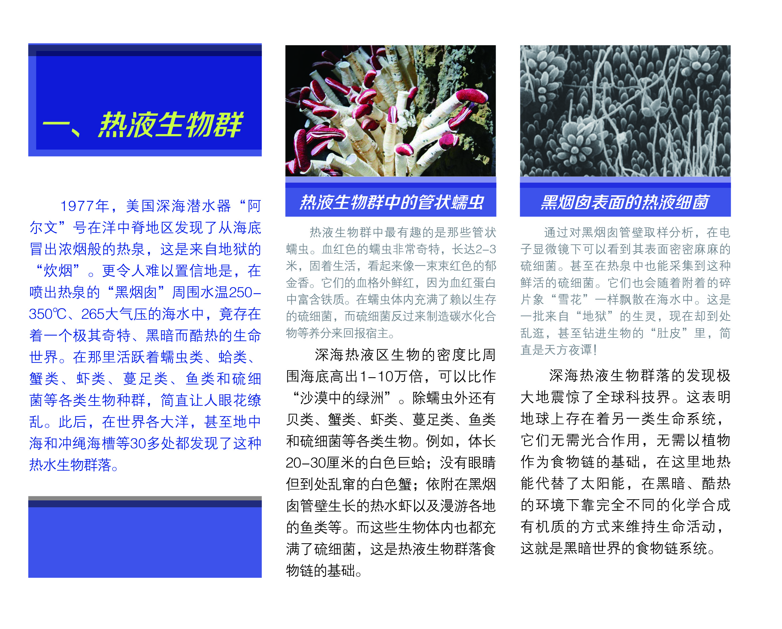 令人难以置信地是,在喷出热泉的“黑烟囱”周围水温250-350℃、265大气压的海水中,竟存在着一个极其奇特、黑暗而酷热的生命世界。在那里活跃着蠕虫类、蛤类、蟹类、虾类、蔓足类、鱼类和硫细菌等各类生物种群,简直让人眼花缭乱。