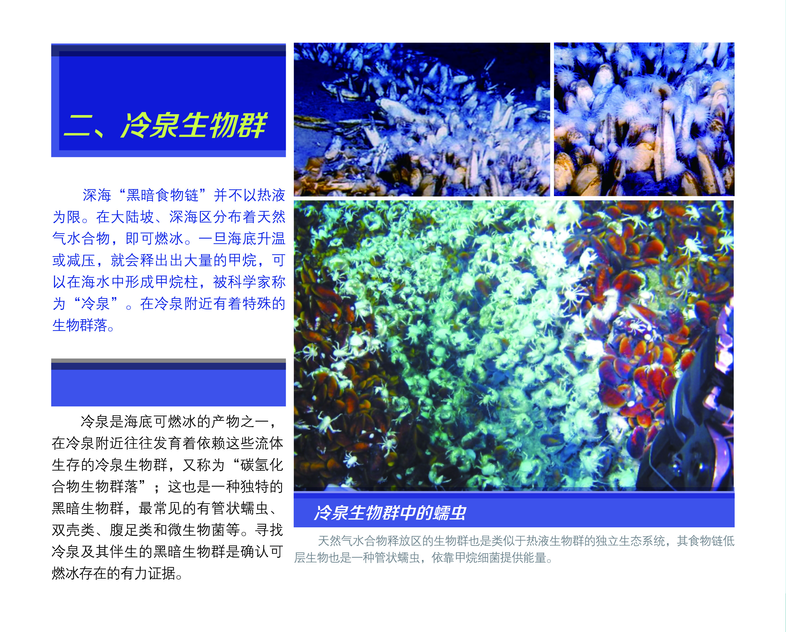 深海“黑暗食物链”并不以热液为限。在大陆坡、深海区分布着天然气水合物,即可燃冰。一旦海底升温或减压,就会释出出大量的甲烷,可以在海水中形成甲烷柱,被科学家称为“冷泉”。在冷泉附近有着特殊的生物群落。