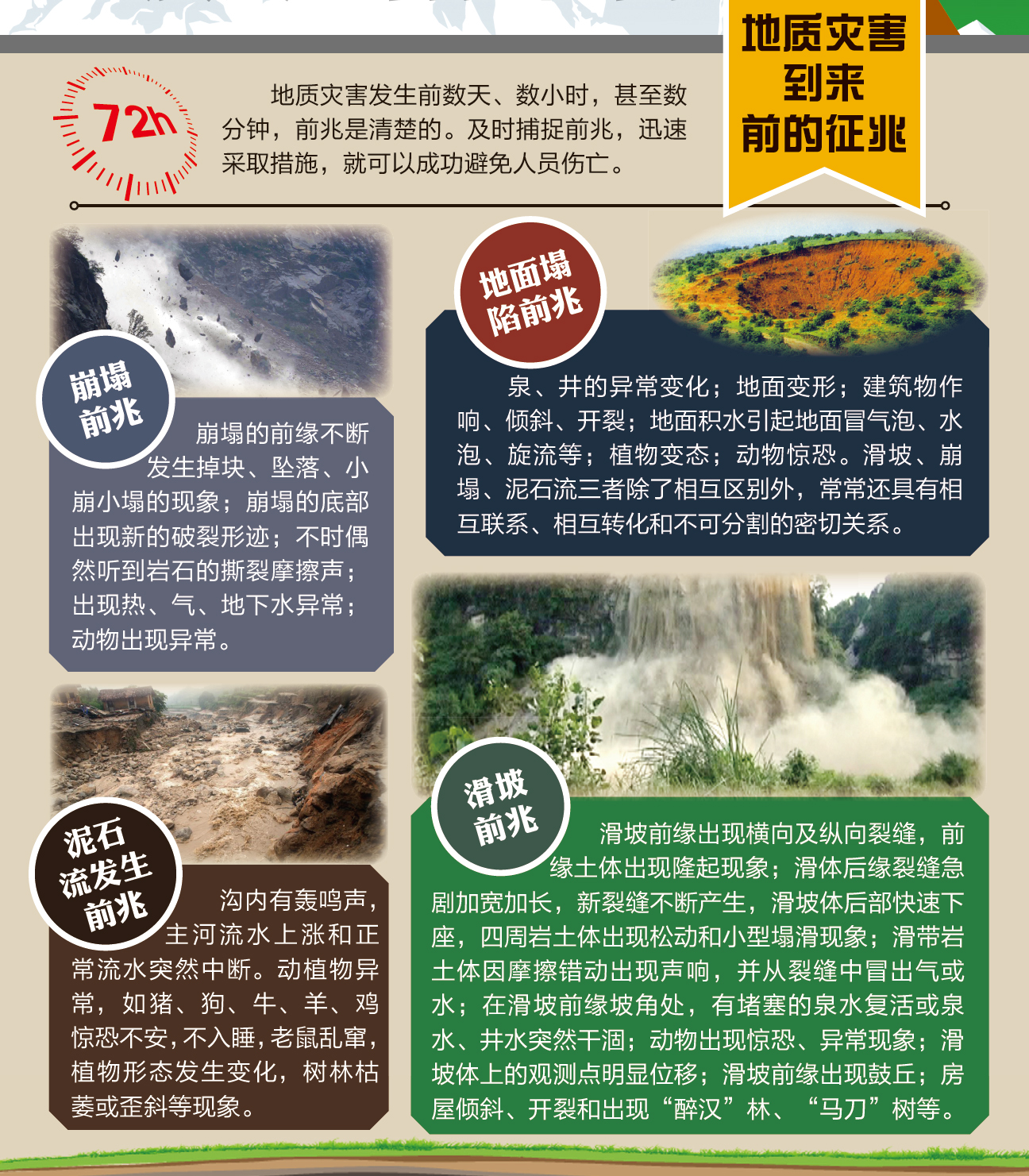 地质灾害发生前数天、数小时,甚至数分钟,前兆是清楚的。及时捕捉前兆,迅速采取措施,就可以成功避免人员伤亡。