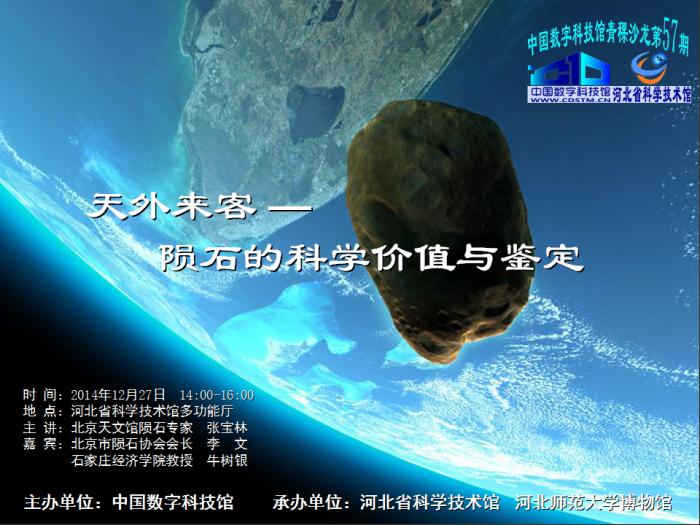 陨石被人们誉为"天外来客",通过陨石我们可以了解宇宙中恒星等天体的演化历史。研究陨石的成分和来源对人类航天事业及探究生命的起源等都具有重要的科学价值。陨石有何特征?如何鉴别?哪些人拥有陨石?陨石可以在国际市场上交易吗?陨石的研究对天文学的发展有哪些贡献?针对以上问题,国际著名陨石专家,北京天文馆张宝林老师将在本次沙龙中和大家深度探讨,并在现场为广大陨石爱好者“鉴宝”。