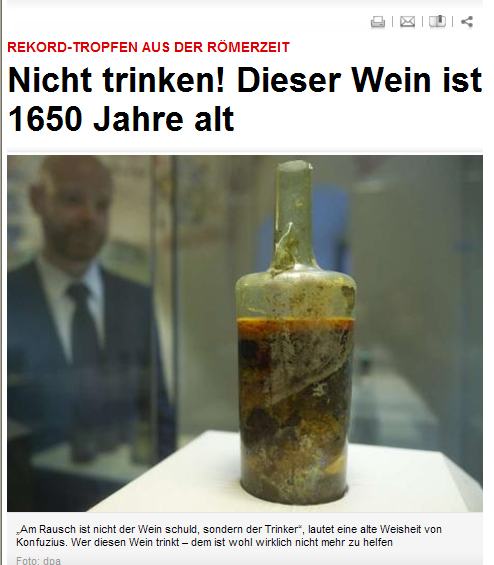 据德国《图片报》12月8日报道,对于品酒师来说,年代越久远的葡萄酒就越受欢迎。然而,近日德国施派尔(Speyer)一家历史博物馆收藏的古老葡萄酒可能会让品酒师们敬而远之。
