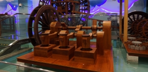 水碓是以水为动力的一种谷物加工机械,在西汉末年便已出现。设置两个碓以上的叫作“连机水碓”,为西晋杜预(222—284年)所创制。它由立轮、轮轴、拨板、碓杆、碓头、碓臼等部件组成。流水冲击立轮使其转动,轮轴上的拨板拨动碓杆末梢,使碓头一起一落地舂捣谷物。这种装置,可以平均地利用水力,减少消耗,提高效率。