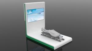 展品“雪橇疾驰”使用VR设备模拟除了雪橇的比赛过程。我们可以躺在雪橇造型的设备中,通过佩戴VR眼镜,感受雪橇运动的过程。