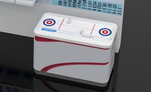 这件展品是一个模拟冰壶运动中扫冰的一个小游戏,观众可以拿着“冰刷”,在屏幕上摩擦,通过在冰壶前方不同的位置摩擦来控制冰壶的运动轨迹,从而掌握冰壶取胜的技巧。