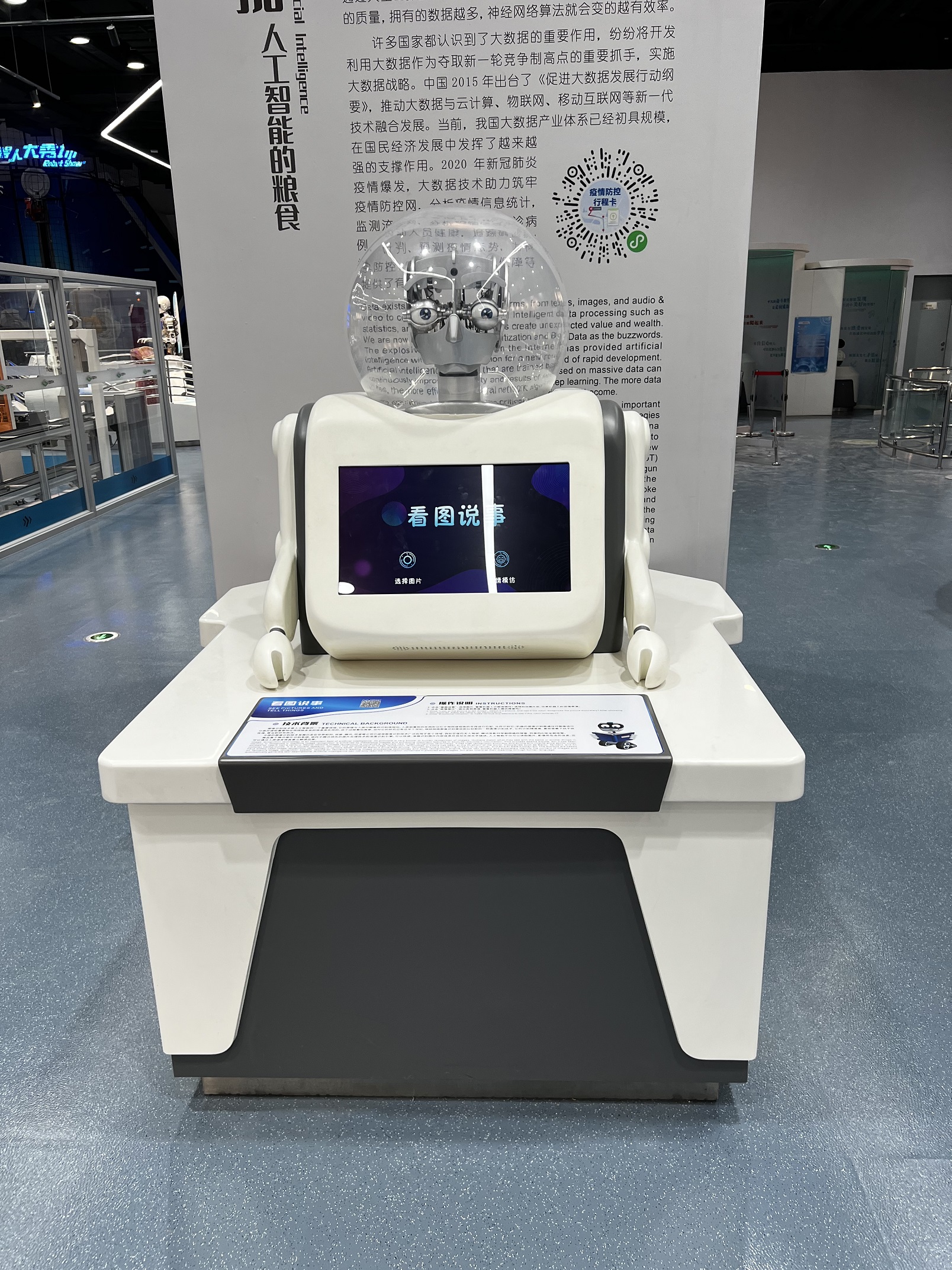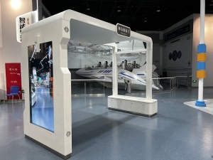 展品是一个公交站造型的结构,一面立墙上设置有双面OLED显示屏,其中一面看起来是一块透明的玻璃,另一面看起来像镜子。通过将展厅现实的场景与虚拟的科幻元素相融合,如飞行的飞碟、展厅内行走的机器人等,使观众近距离感受AR增强现实技术带来的奇妙体验。