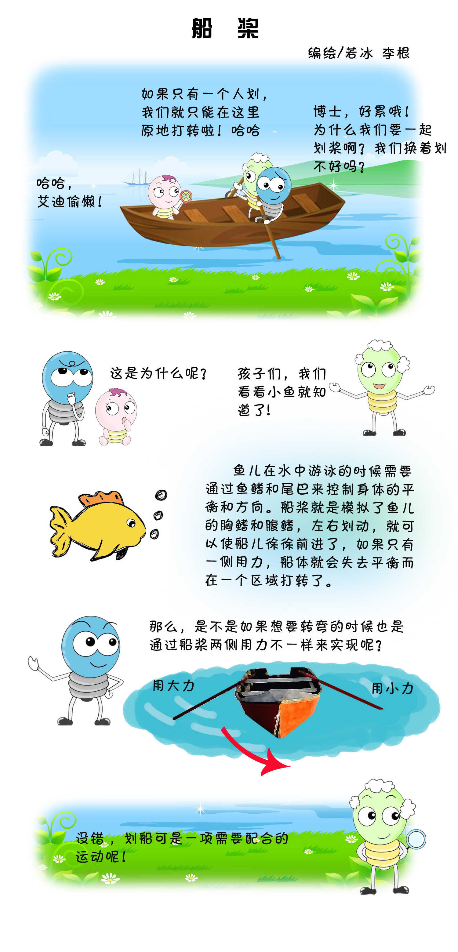 船桨是一种上端为圆杆,下端为板状的划水工具,根据鱼的胸鳍和腹鳍而发明,其作用与鱼鳍一样,一下一下地前后划动,使船体徐徐前进。利于手握的圆杆叫握杆;用以拨水的板状叫桨板。