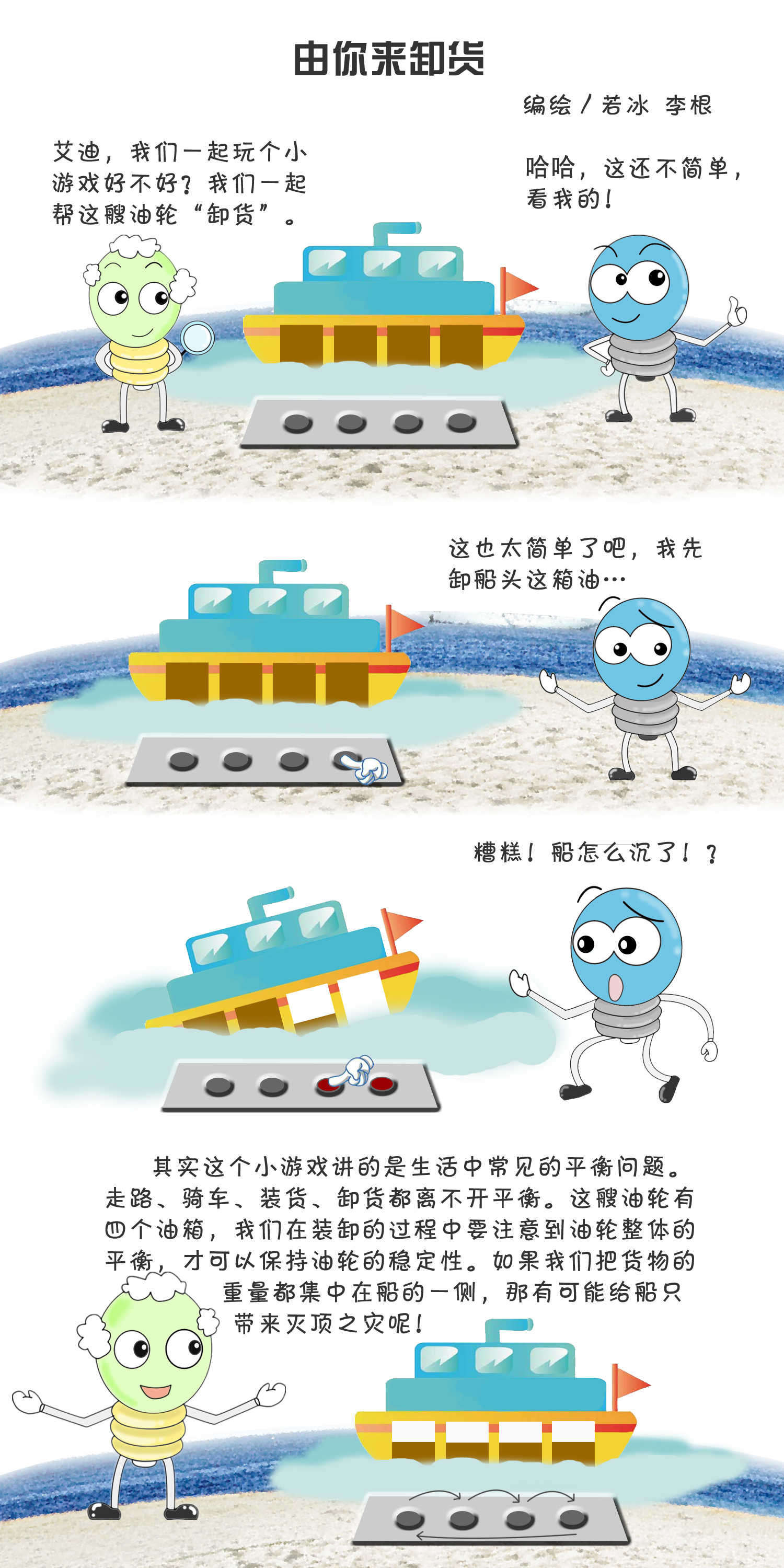 这件展品就是通过一个油轮模型让您亲自体验一把油轮的装卸货过程。该油轮主要包含四个油箱,分别由四个滚轮块进行控制。油轮前面的四个液晶显示器,分别显示油箱的液面变化过程和当前油轮的平衡状态,您要时刻注意货物的分配和重量的均衡。如果由于装卸货不均匀导致船只不平衡,如一味的将货物装在船体的一端,就会导致船体倾斜;将货物集中放在头尾两端,船体两端沉,中间轻,由于浮力的作用,就会使船舶产生从中间断裂的危险。所以,在船装卸货时,要时刻注意重量的分配,一定要均匀地分配货物,保持船体平衡。