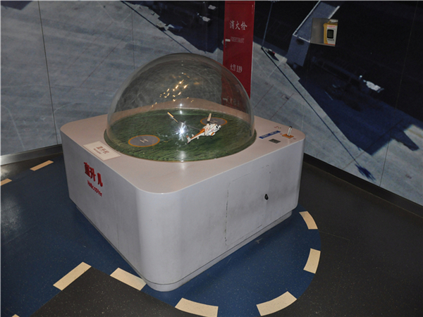 这件展品叫做“直升机”,由直升机模型、支杆组成,支杆的一头与直升机连接,直升机模型处于悬空状态,您可以按动“启动”按钮,随后可以操作操纵杆,使直升机进行前后上下的运动。