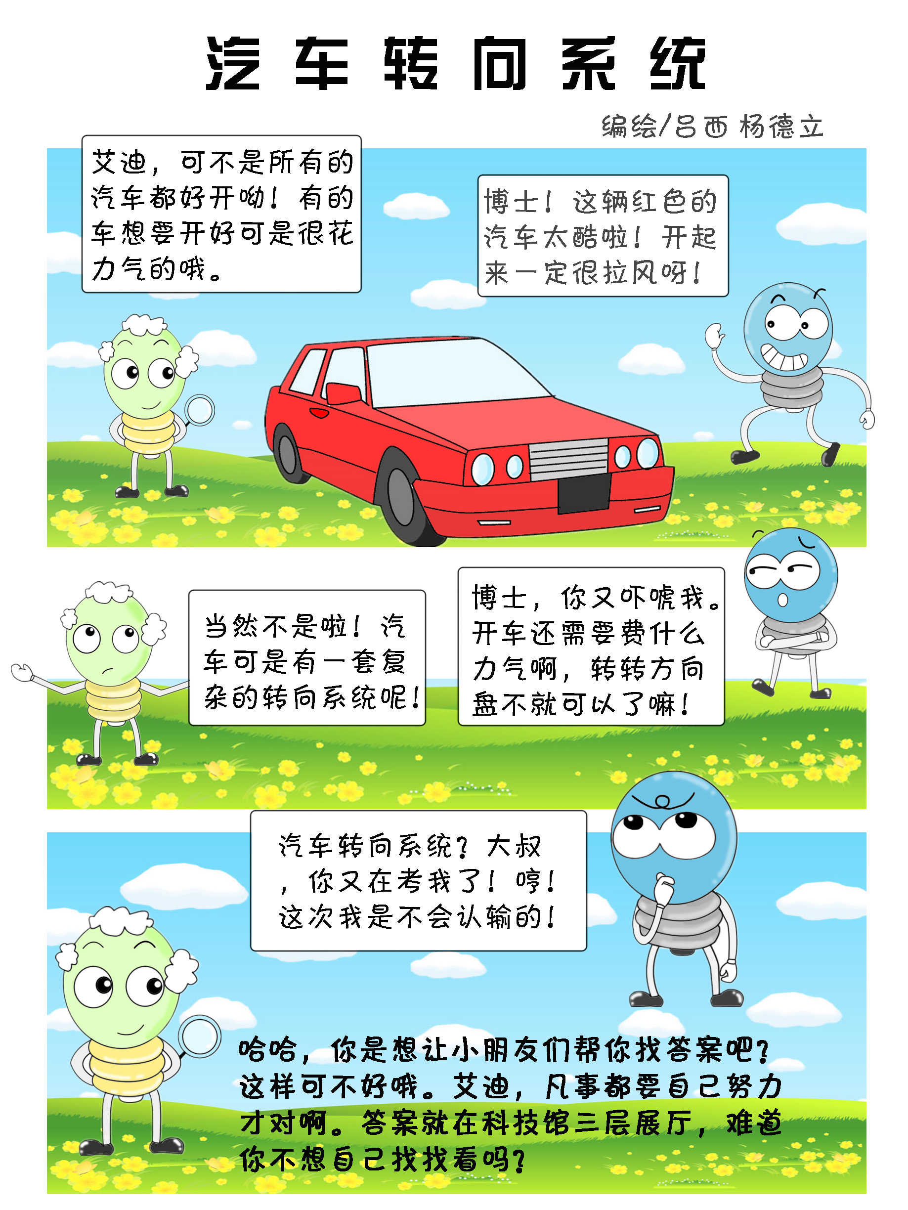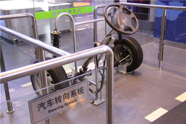 这件展品通过让观众操纵机械系统、液压助力和电子助力系统三个模型,感受三种转向系统的区别,感受科技进步带来的便利。