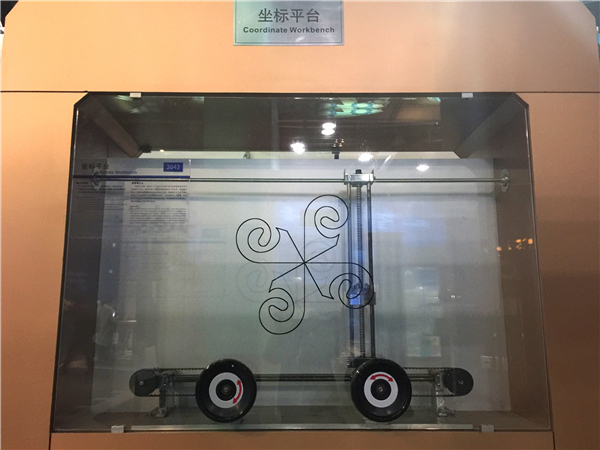 本展品采用对称的滚珠滚珠丝杠结构,体验者通过转动两个操作手轮,控制目标工作台沿您想要的轨迹运动。