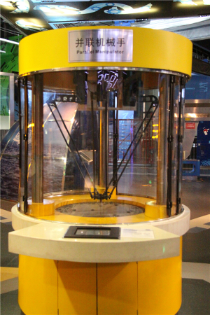 这是一个以展示智能并联机械手臂的展品。通过体验者信息的输入,并联机械手臂可以在工作区域内快速的实现图形的拼写,展示了新型智能并联机器人的高速性与智能型。