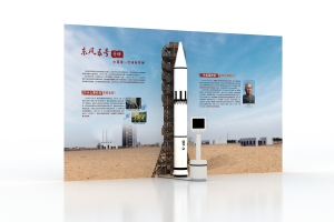 大家现在看到的是按比例缩小后的东风五号导弹模型,东风五号为液体两级导弹,全长32.6m,最大直径3.35m,起飞重量188吨,最大射程12000公里。它的两级推进剂均用四氧化二氮和偏二甲肼,它的箱体采用高强度铝铜合金,“大脑”采用集成电路计算机,“眼睛”采用惯导平台。有了电液伺服机构,它可以摆动大推力发动机,强有力地改变飞行方向。大家也可以通过平板了解东风五号导弹内部的大致结构以及通过点击屏幕相应按钮观看导弹发射演示视频。