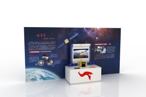 本展项通过增强现实技术让观众认识和了解到“悟空”号暗物质粒子探测卫星各部分组成及作用(塑闪阵列探测器模块、硅阵列探测器模块、BGO能量器模块、中子探测器模块),以及对我国空间天文学科研究的巨大推动作用。当观众将模块插入到模型相应位置,屏幕里科研场景同步嵌入该拼装模块,四个模块拼插完成后,转场至震撼的悟空号发射及寻找暗物质的动画。