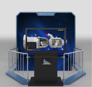 展品由神舟七号中等比例剖面模型(含轨道舱、返回舱和推进舱)、小型展台、触摸电子显示屏、音响、AR演示系统等组成。通过三维动画展示航天员出舱过程,并通过识别观众手势进行互动。音响系统播放翟志刚出舱后,对地球广播的发言录音。使观众了解中国历史上首次太空行走的情形,了解我国是世界上第三个有能力独自开展太空出舱活动的国家。以翟志刚出舱后的发言录音,激发观众的临场感与民族自豪感,使观众铭记中国人对探索太空作出的贡献。