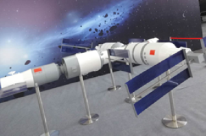 展品为已公布的空间站实物模型。通过观看空间站外形,了解空间站的基本组成,即由一个核心舱和两个试验舱组成,使观众了解建造空间站的意义、空间站的组成和作用,了解我国正稳步迈向“空间站时代”,中国已经成为航天大国,现正在向航天强国迈进。