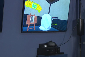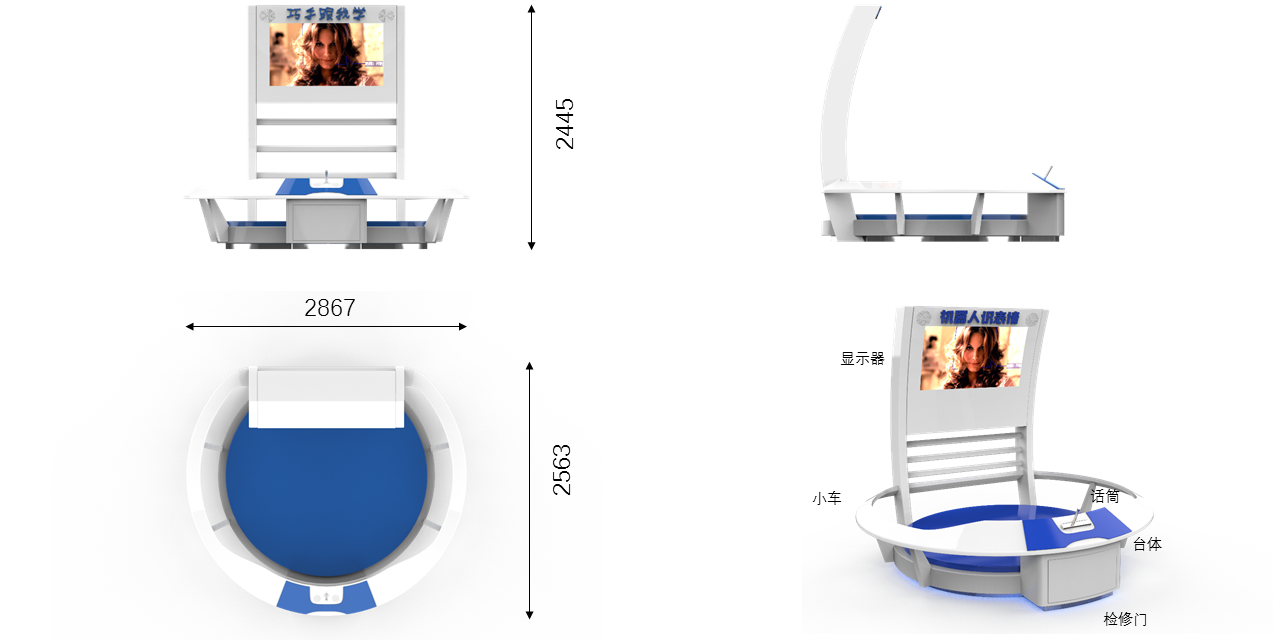 虚拟创作这件展品,通过虚拟现实的设备,为大家高度还原了一个美术学院里面的雕刻教室。虚拟创作这件展品,主要由以下几部分构成:机柜里面有一台高性能的电脑,上面是一台液晶显示器,核心设备是虚拟眼镜的头盔和虚拟的手柄。