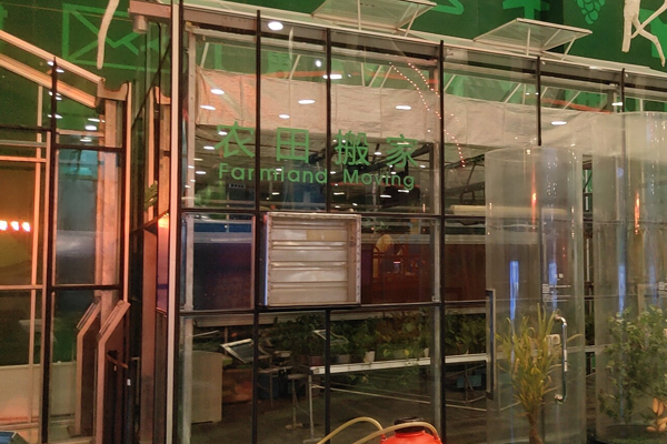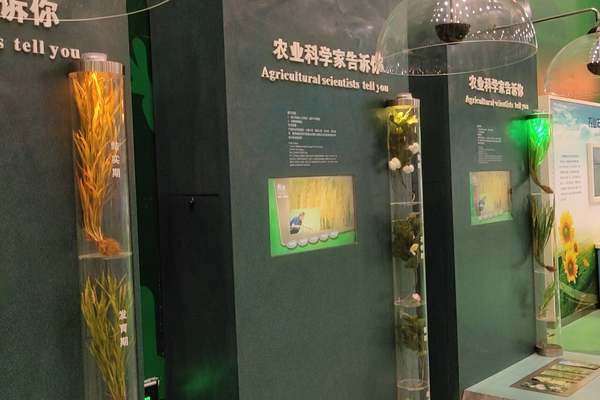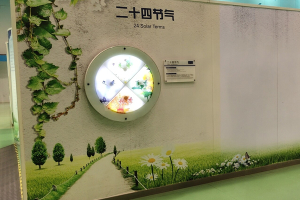 二十四节气这件展品是由圆形灯箱、多媒体投影以及互动按钮共同组成的。