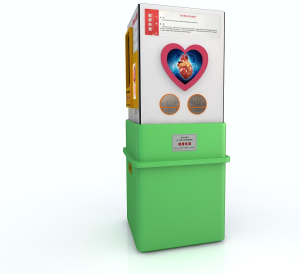 双手放置于检测区,观看显示屏中心脏实时的闪动频率,同时观看多媒体介绍的心脏相关知识。
