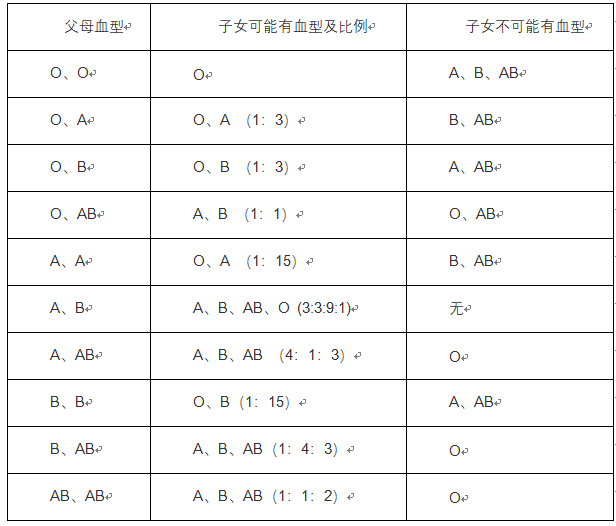 血型遗传是临床输血和器官移植配型的理论基础。血型作为一种遗传性状很少受环境的影响,因此是极好的遗传标志,可用于亲子鉴定、疾病关联分析和人种演化研究。1900~1902年奥地利医学家K.兰德施泰纳等应用红血型遗传细胞凝集试验首次发现红细胞表面有两种抗原──A 抗原和B抗原。A型、B型、AB型和O型是人类中第一个被发现的血型系统,为单一座位上的IA、IB和i三个复等位基因所控制。父母血型的不同配对可能形成以下的血型规律: