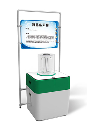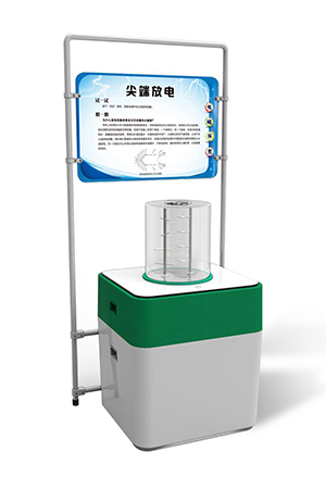 启动展品,随着两个电极逐渐靠近,我们看到在两个电极尖端之间发生了强烈的放电现象。由于导体上的电荷分布与导体的表面形状有关,尖端部分往往电荷分布比较密集。当电荷聚集到一定密度时,会产生很强的电场,尖端附近的空气被电离,也就是我们看到的电火花。