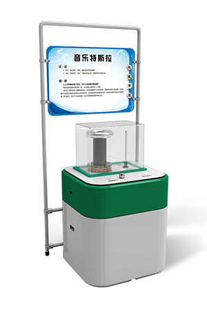 这件展品的主体是特斯拉线圈,它是一种高频率变压器,通过它可以获得上百万伏的高频电压,当击穿空气释放电能时,就形成了电弧,会造成周围空气的振动,从而发出声音。当放电的频率改变,空气的振动频率也随之改变,由此产生不同的音调。在特斯拉变压器的输入端加入音频信号,使放电频率随音频信号变化,这样你就听见了相对应的音乐。对着麦克风喊话,仔细听一听你自己的声音?