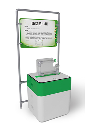 流体力学中有一条著名的伯努利定律:空气流动的速度越大,压力越小。展台下方有一个风机,按下“启动”按钮,风机会沿着右边的竖管向上吹风,竖管里的空气快速流动,压力就变小了,而外界空气压力是正常,形成压力差,空气会从压力大的位置向压力小的位置流动,所以空气就沿着C形管,被源源不断地“吸”进了竖管里。小球则顺着气流的运动,沿着C形管跑圈,周而复始,。