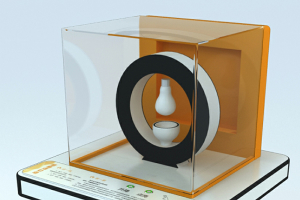 展品内部安装了永磁铁、磁线圈和磁场敏感元件,线圈通电后会产生磁场。灯泡的螺口处装有永磁铁,在顶部线圈磁场的作用之下会产生吸引力,通过电气系统的控制使得磁力与灯泡的重量相同,灯泡就会在磁力的作用下与线圈保持相对平衡的距离实现“悬浮”效果。另外,灯泡隔空点亮利用了电磁感应式的无线供电技术,灯泡内部有一个接收线圈和LED发光元件,灯泡下方的发射线圈通过电磁感应在接收线圈中产生一定的电流,从而点亮LED。