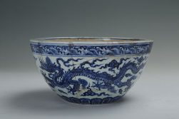 明永宣时期的青花,盆里沿绘缠枝花一周,内壁绘缠枝花7朵,盆底绘回纹一周,回纹内绘八瓣团花,花瓣呈变形蕉叶纹,纹内又绘暗八仙。盆外沿绘折枝花卉8朵,外壁绘缠枝花卉7朵,底边绘变形朵花纹一周。此盆青花呈色浓艳,有晕散现象,为苏泥勃青料所致。纹饰繁复生动,层次分明,是永乐时期受西亚国家金银器的影响而创烧的一种新器型。