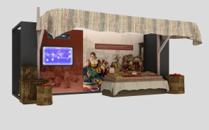 在左边这个水果摊上,您可以看到葡萄、西瓜、石榴、无花果、哈密瓜等等。这些水果我们今天都很常见了,但其实它们都不是中国原产的,而是从国外引进的。通过丝绸之路,像马可波罗这样的商人或者张骞这样的使臣,他们翻越沙漠、远渡重洋,为我们带回来了很多好吃的水果。