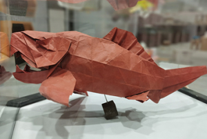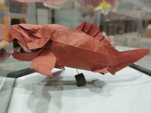 邓氏鱼是一种活于泥盆纪时代(距今约3.6亿至4.15亿年前)的巨型食肉鱼类。本展品用一张正方形纸张,折叠塑造了邓氏鱼的形象。