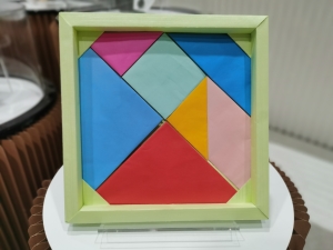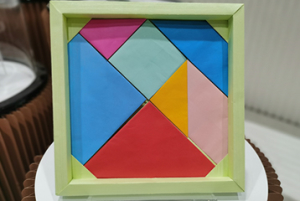 封在相框内的这一组七巧板,是用边长比为1:√2:2的三种正方形折叠而成的,三种规格正方形恰好对应三种大小的图形面积。裁纸、折叠、拼图,绝对是环环相扣的超级有趣的折纸益智游戏!